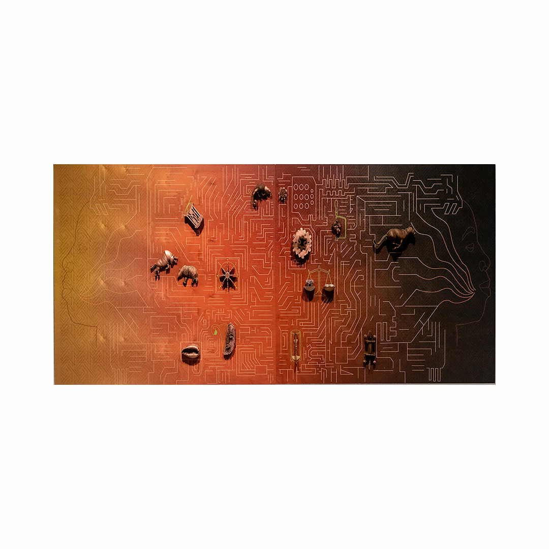 Title: Ogiri Iranti Year: 2023 Medium: Wood, Wood Print, 3D printed Wood PLA, Electroplated Copper, Wood stain, Wood Dye