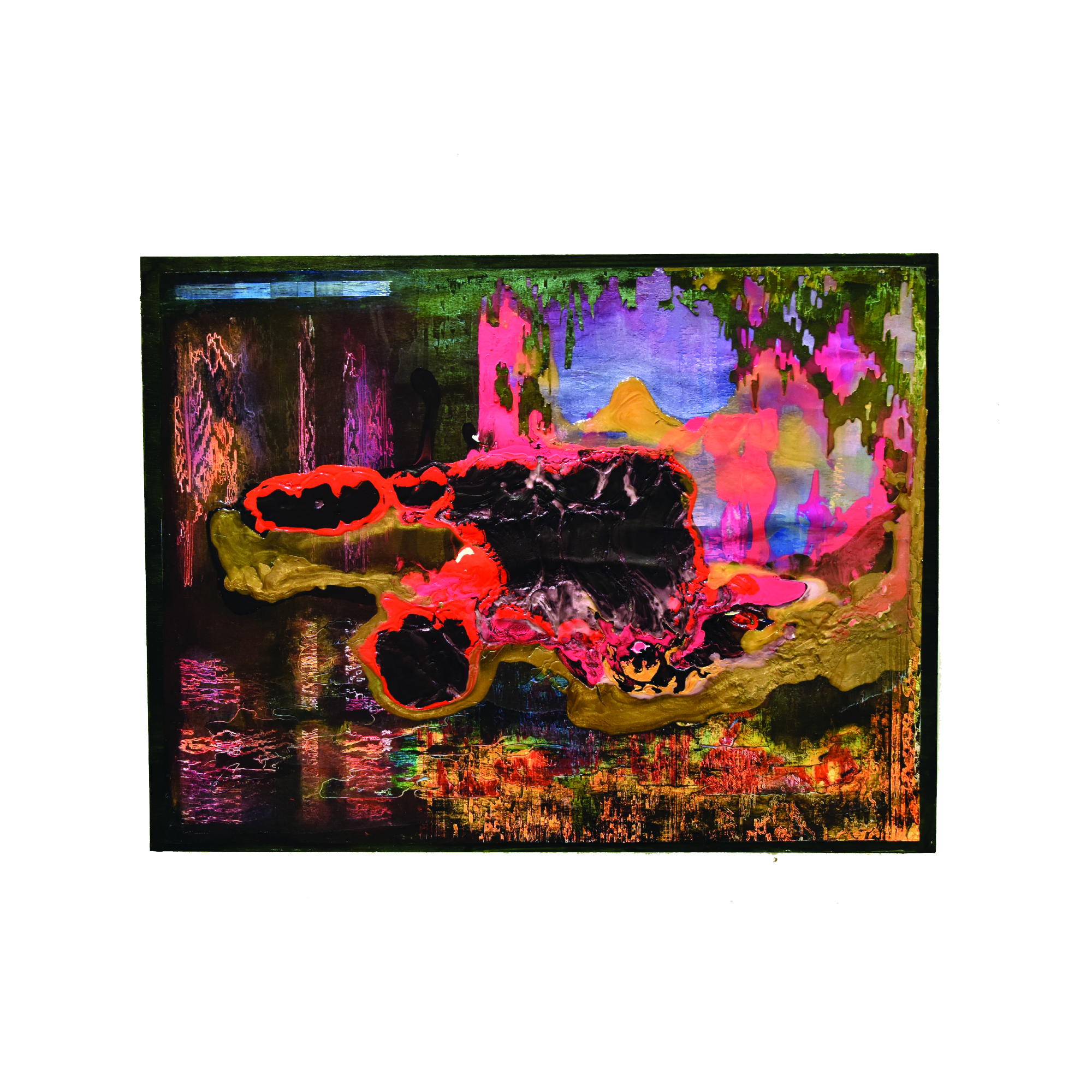 Acrylic, collage, alcohol-based ink, laser etching on 300 gsm Strathmore paper mounted on wood-dyed panel